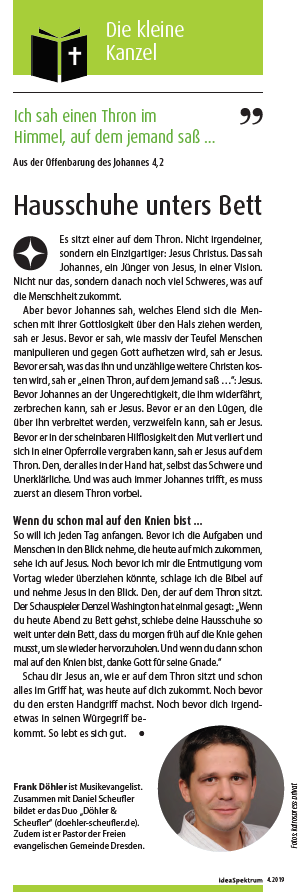 Frank Döhler, Musikevangelist und Pastor der FeG Dresden, schrieb in IdeaSpektrum unter der Rubrik "Die kleine Kanzel" einige Zeilen. Darin verdrängt er Gott von seinem Thron und ersetzt ihn durch Jesus Christus: